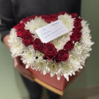 Композиция в форме сердца в шляпной коробке, в составе: розы и хризантемы