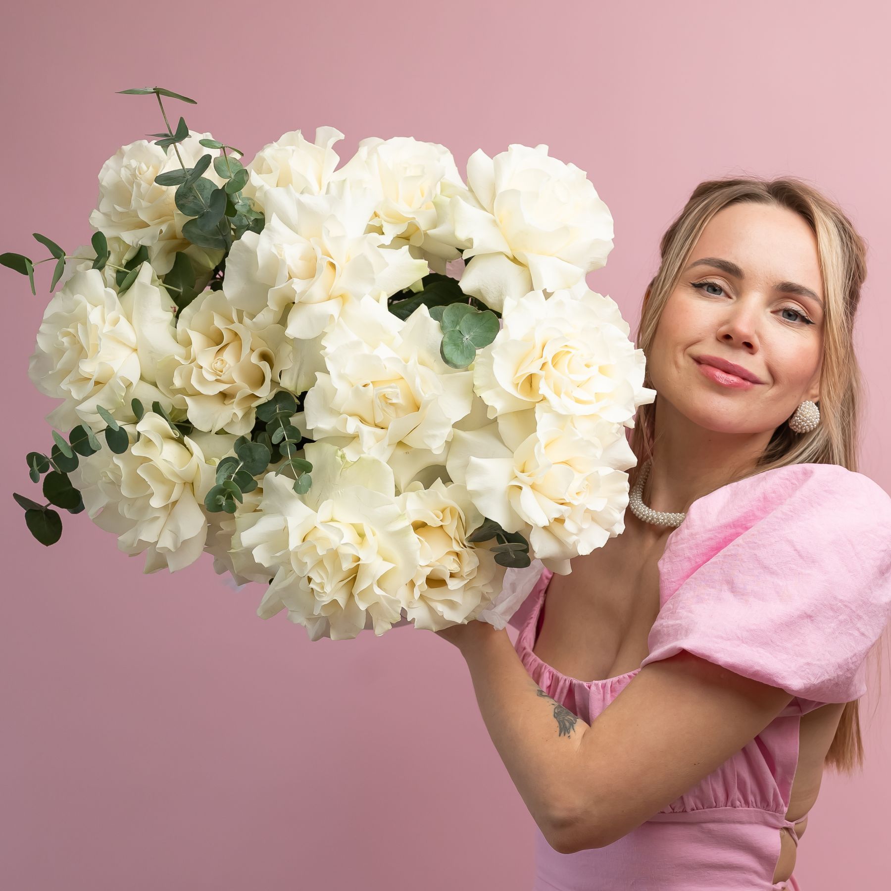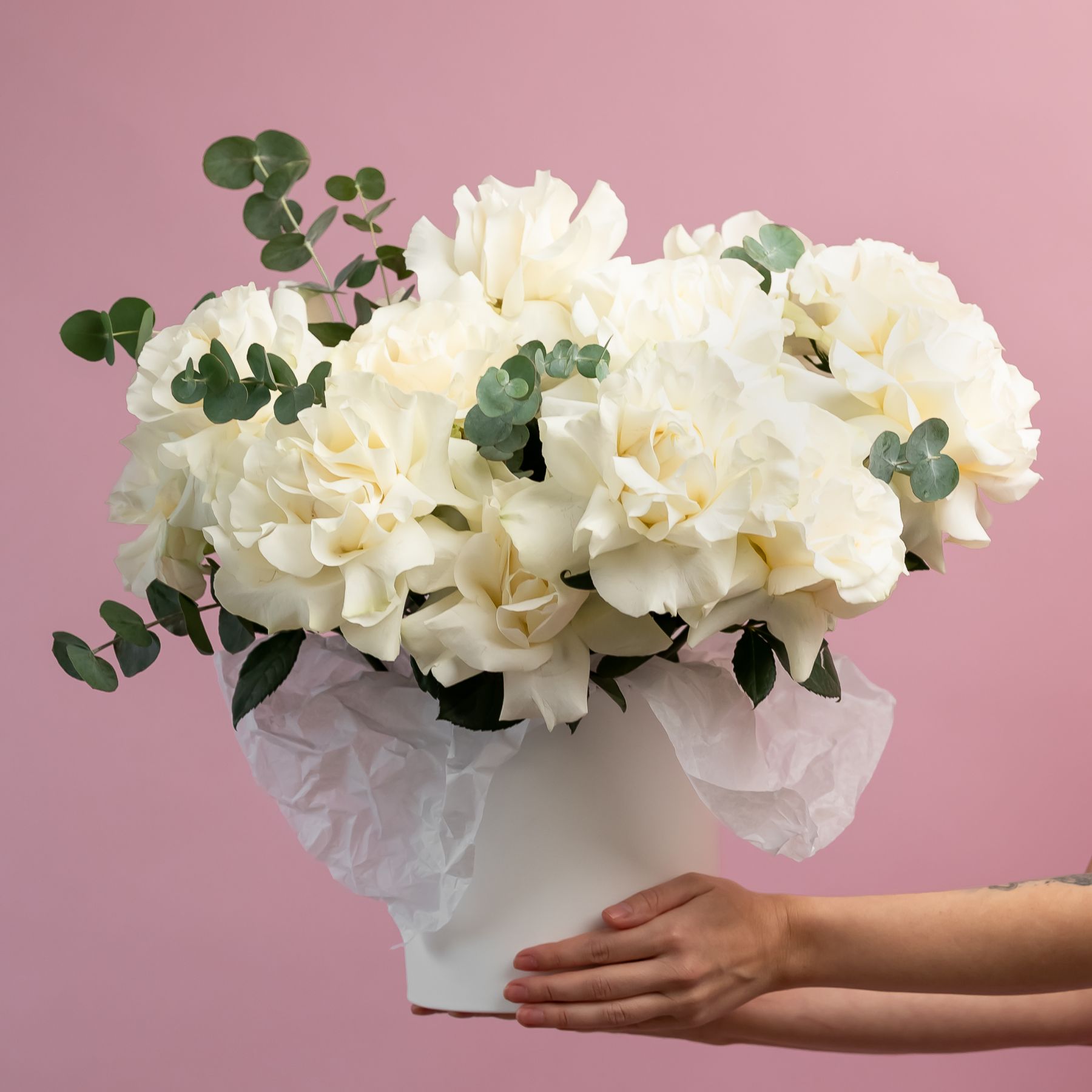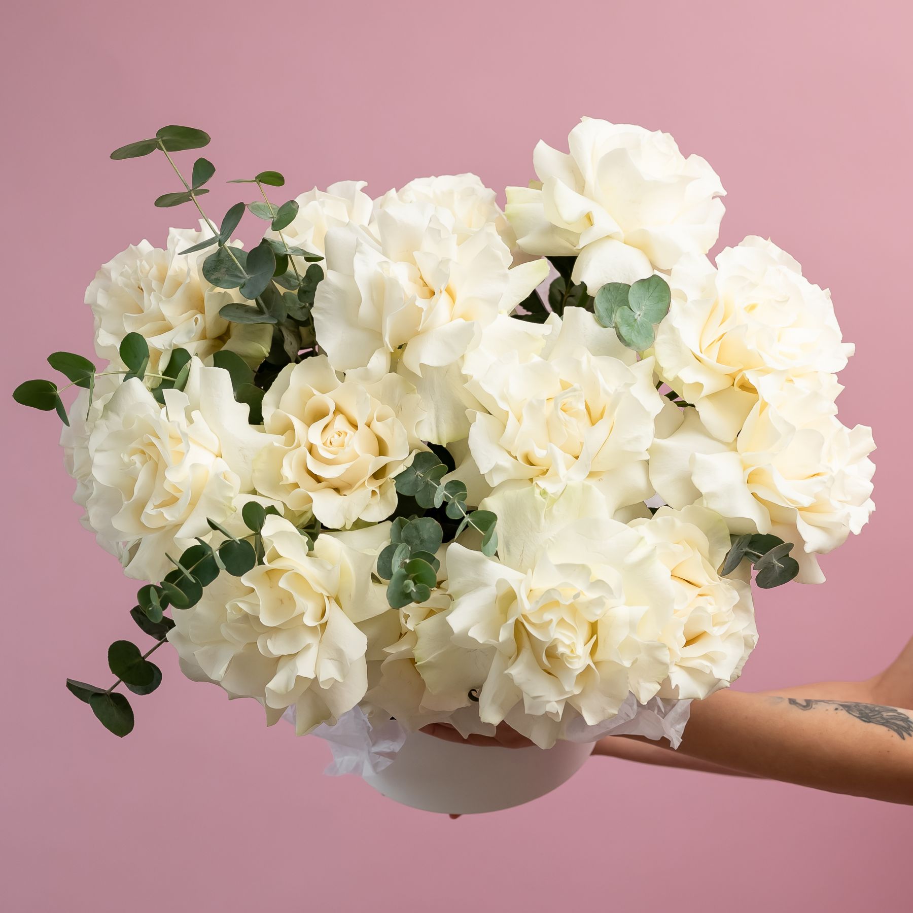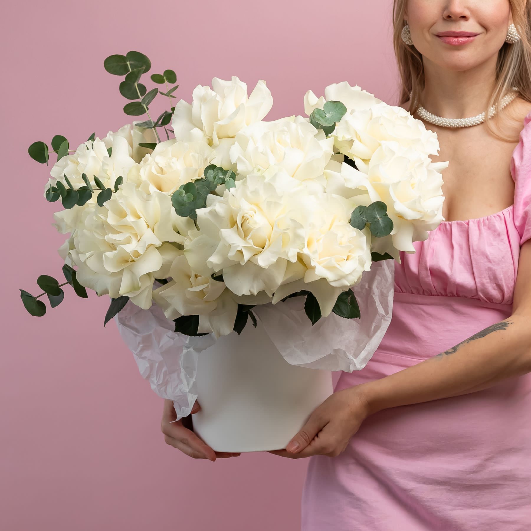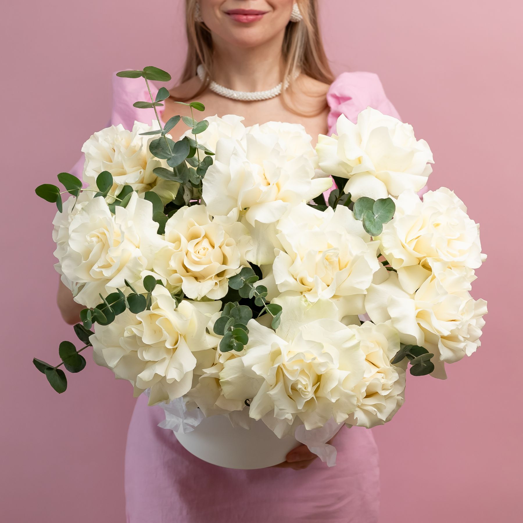 15 французских роз белых в шляпной коробке купить с доставкой в Улан-Удэ за 8750 рублей | «Цветочный BAZAAR»
