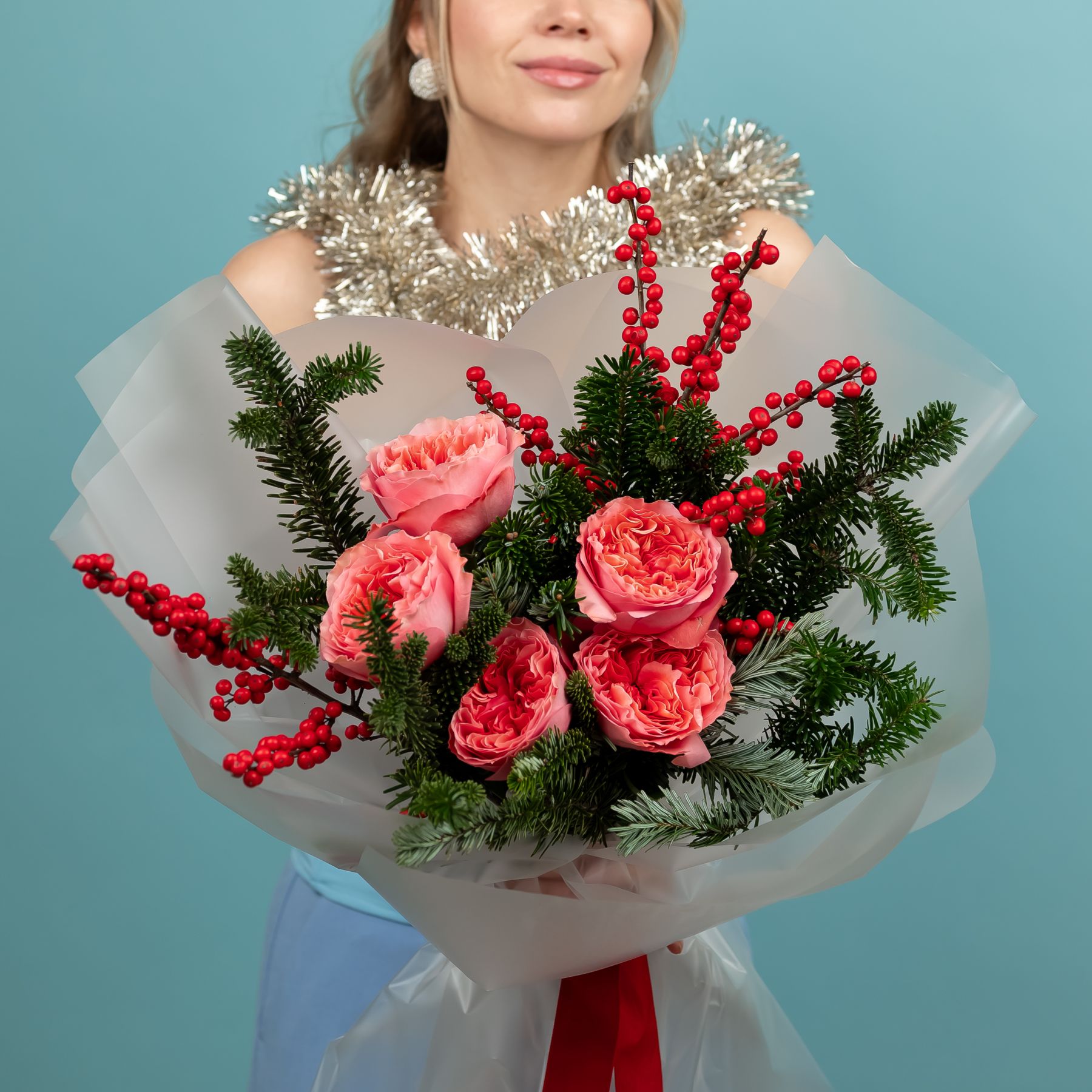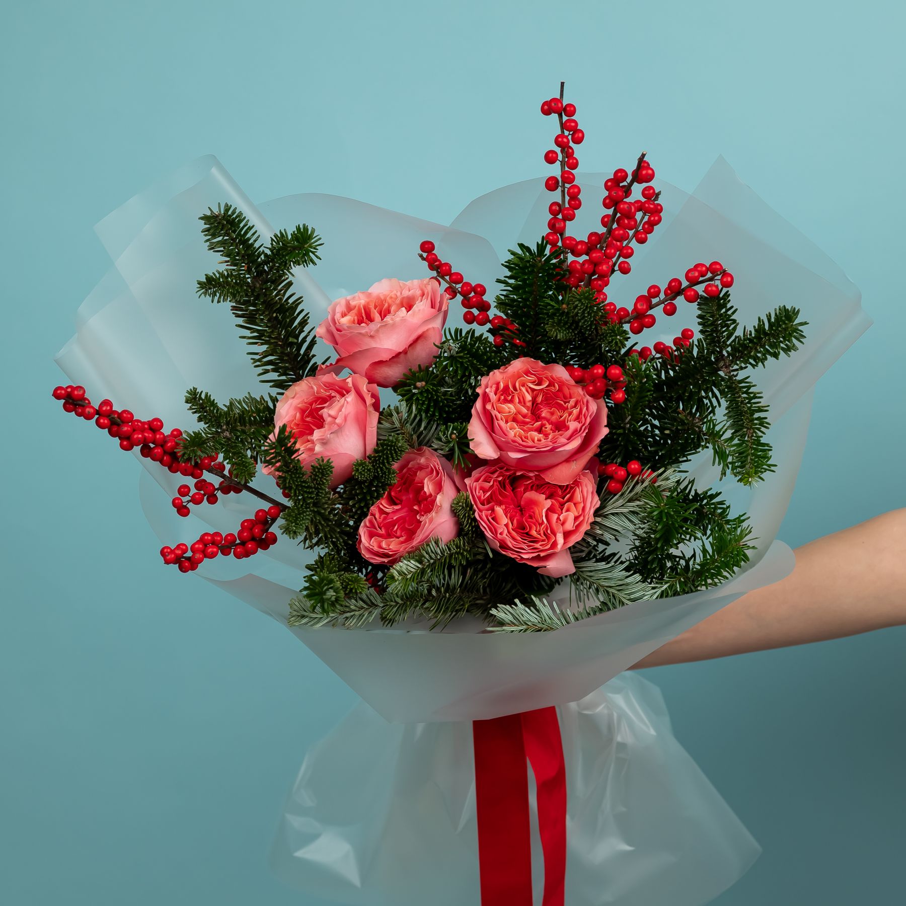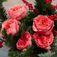 Букет зимний из пионовидных роз с нобилисом