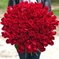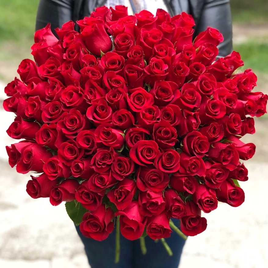 Букет из 101 красной розы 60 см, перевязанный атласной лентой.