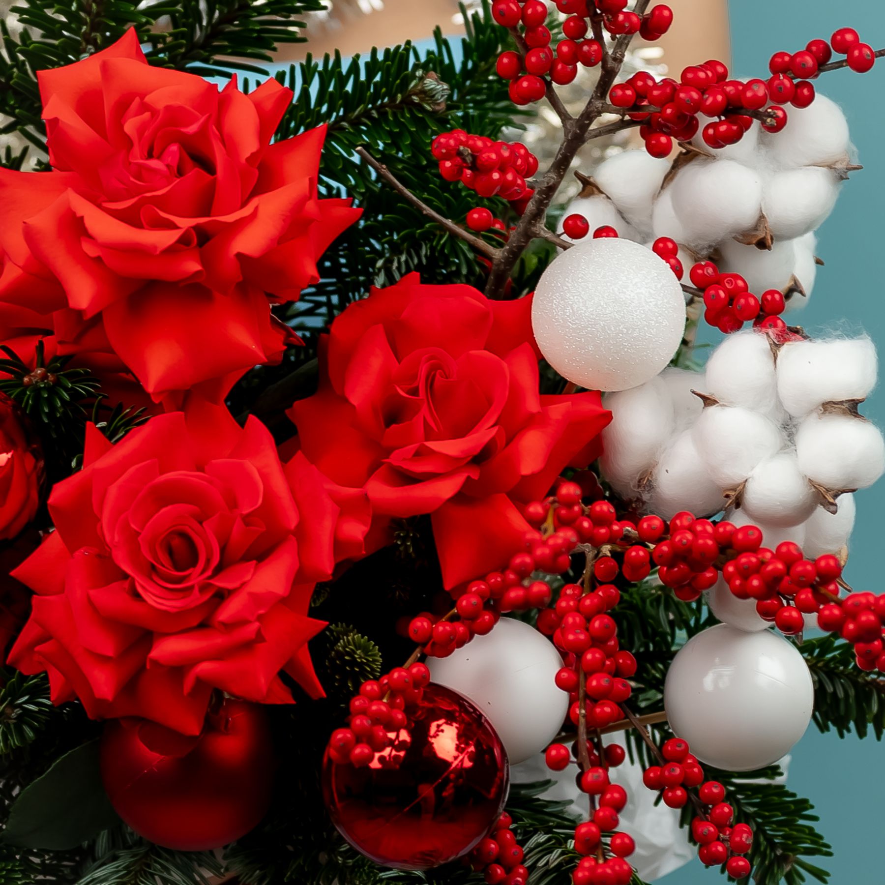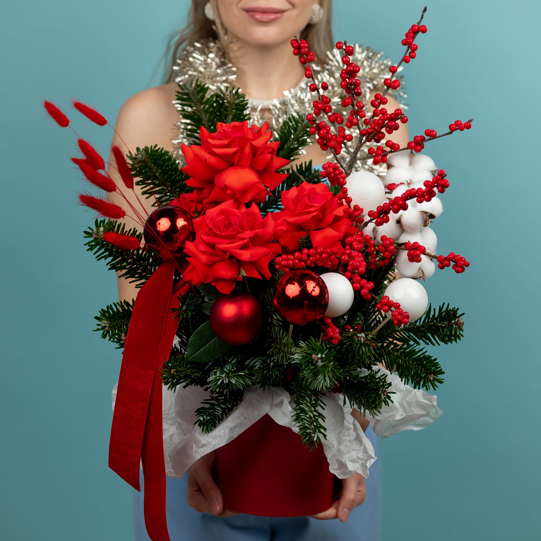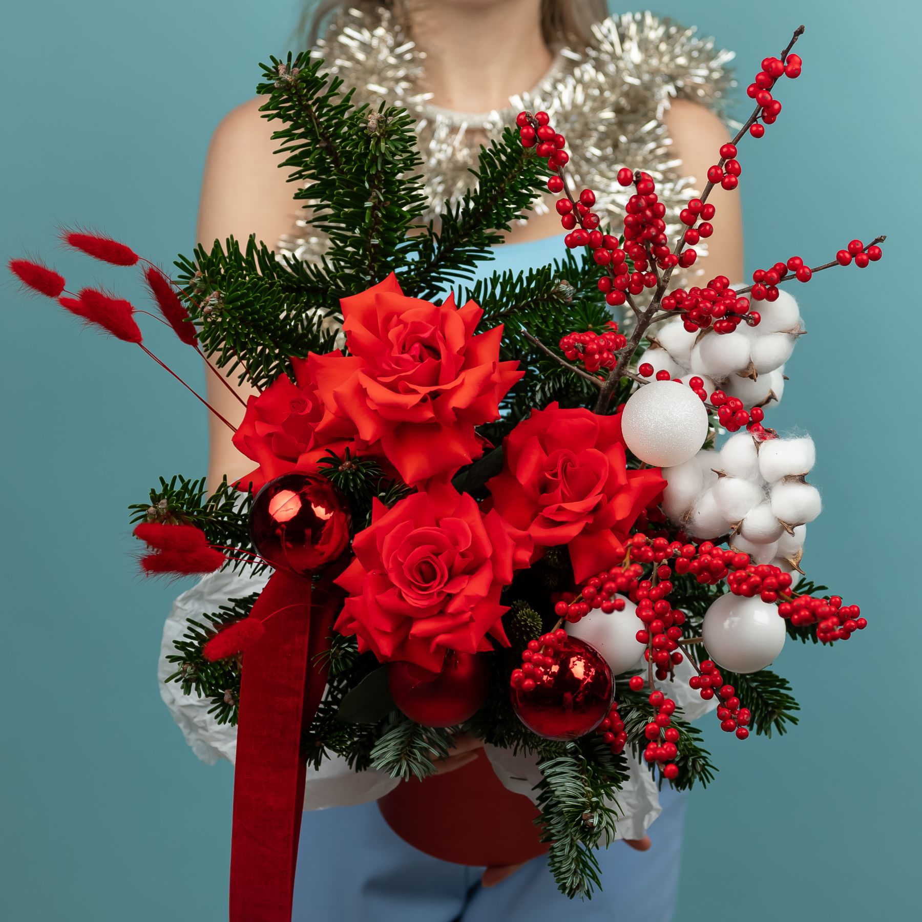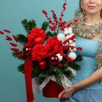 Композиция новогодняя с нобилисом и французскими розами купить с доставкой в Улан-Удэ за 7500 рублей | «Цветочный BAZAAR»