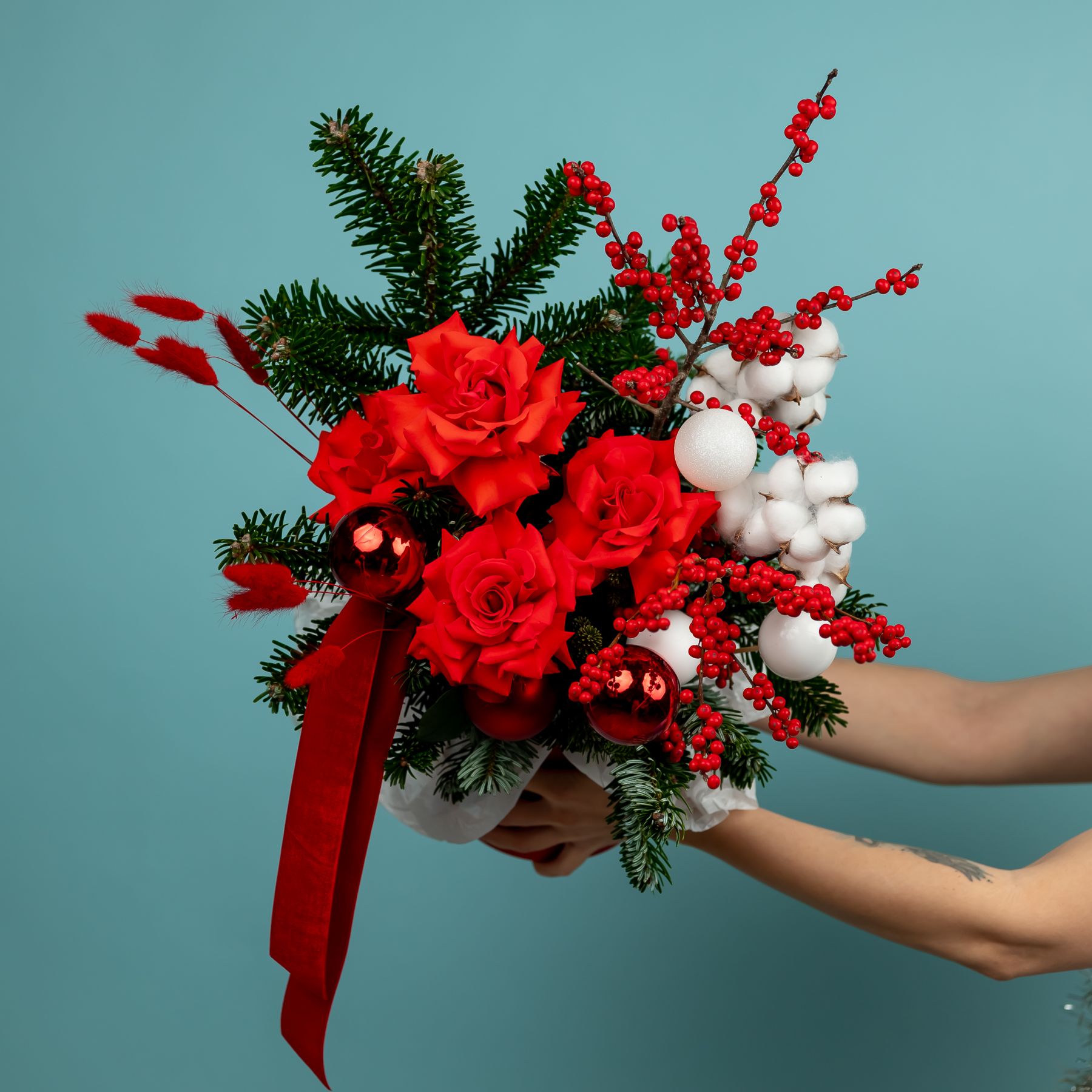 Композиция новогодняя с нобилисом и французскими розами