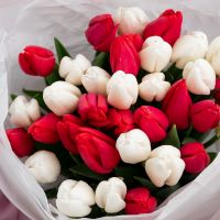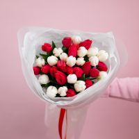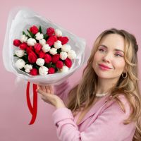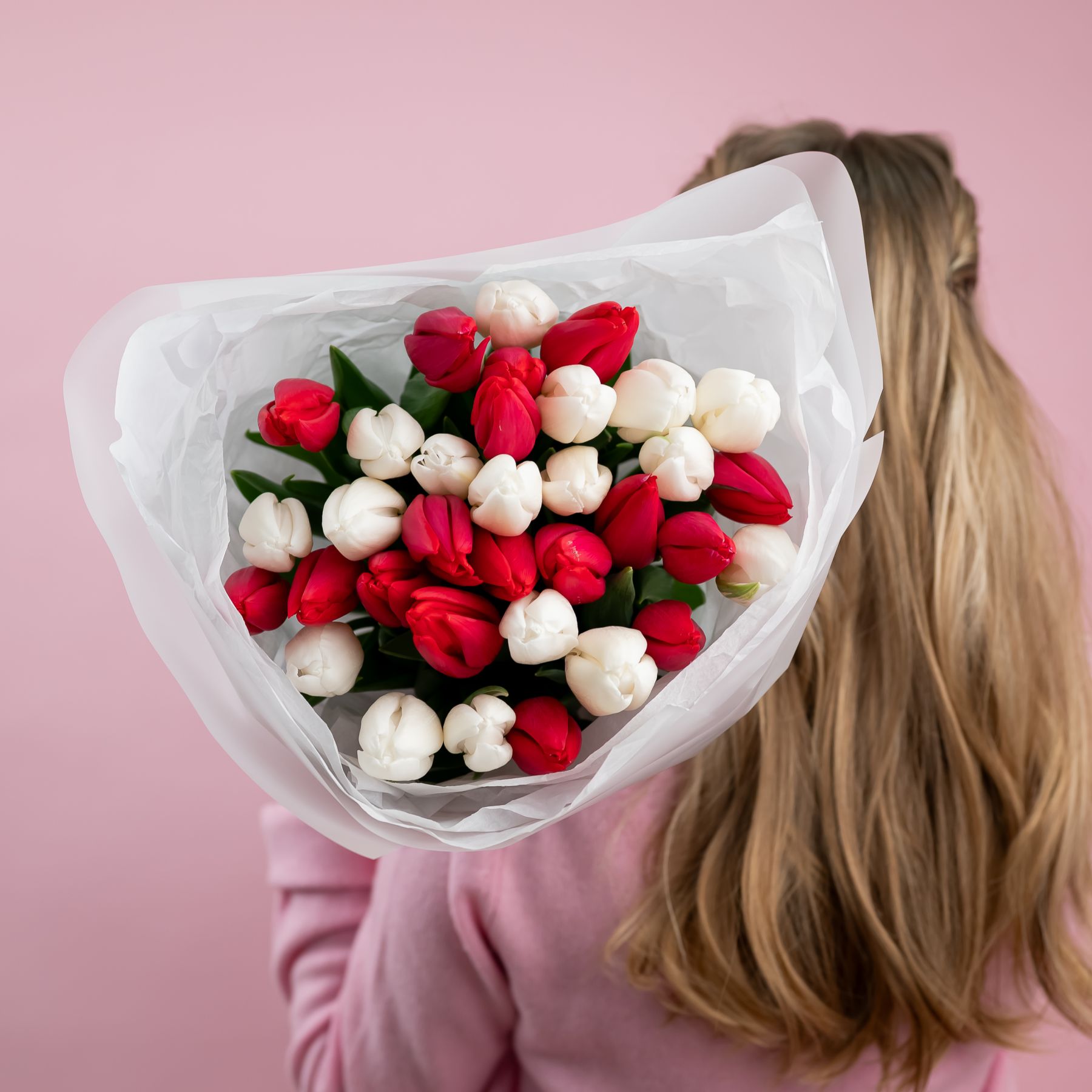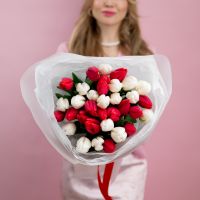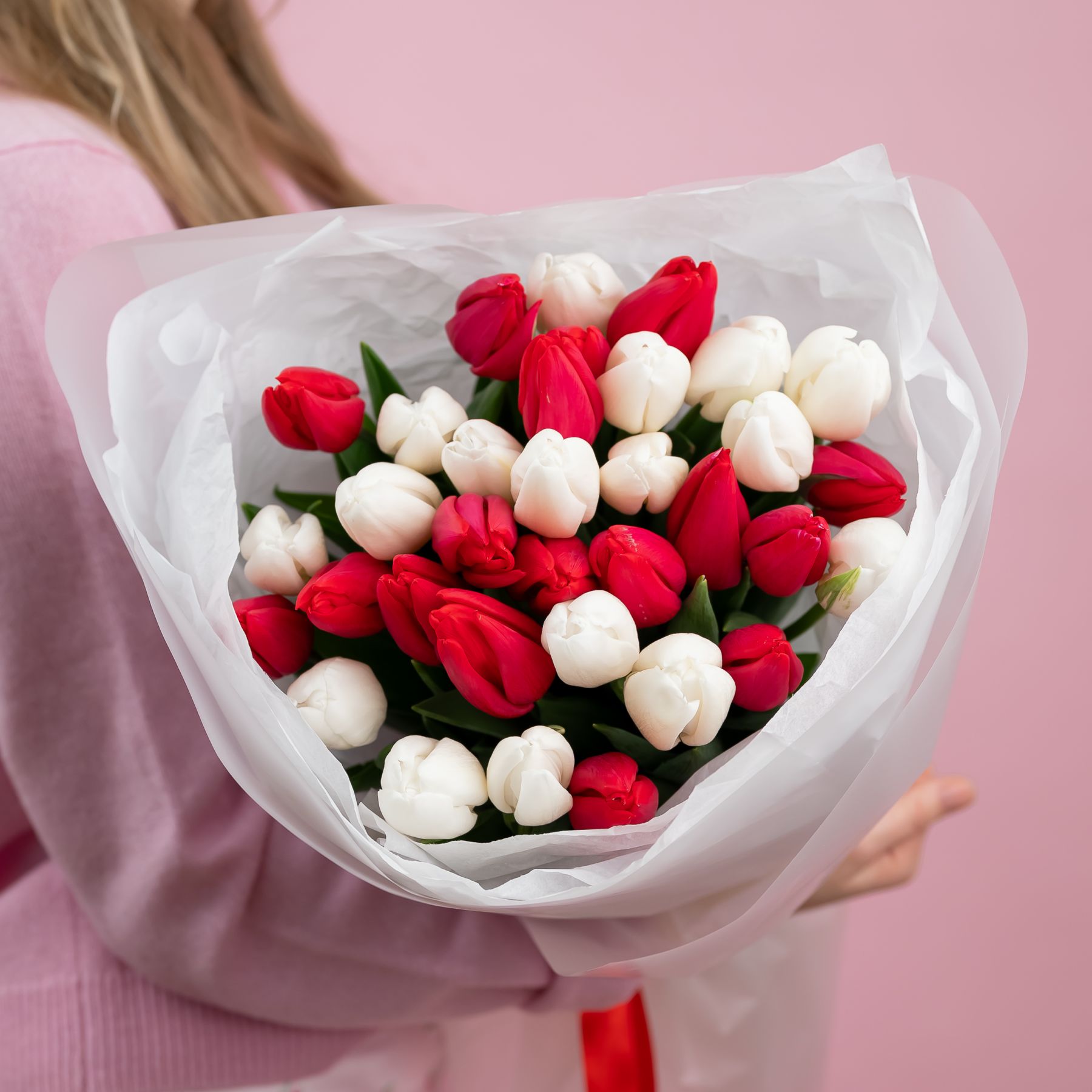 Букет из белых и красных тюльпанов (от 15 шт) купить с доставкой в Улан-Удэ за 4350 рублей | «Цветочный BAZAAR»