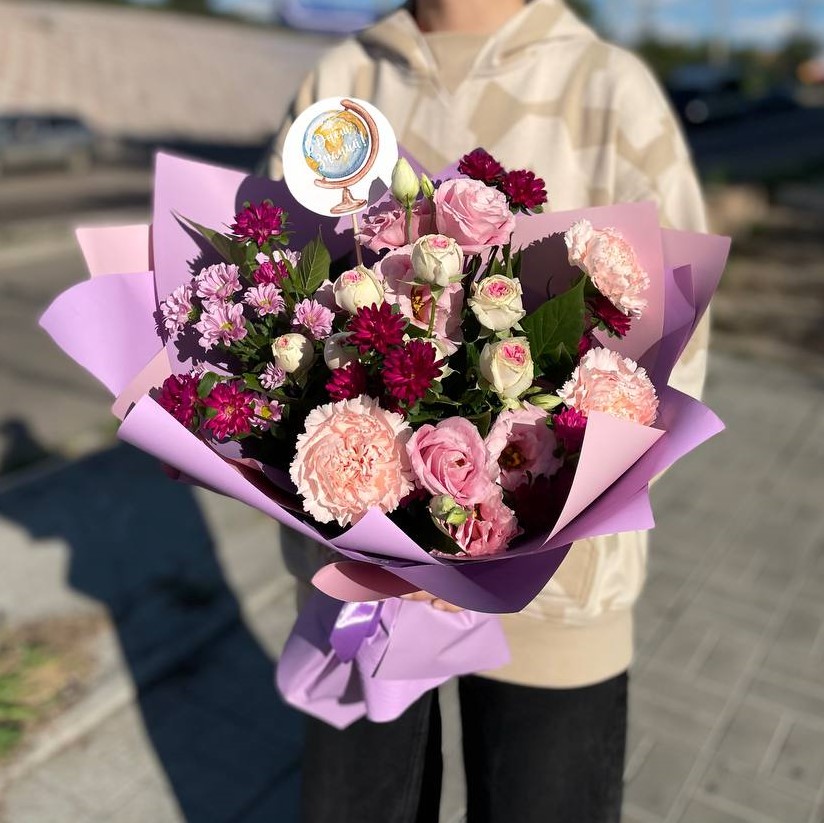 Букет в школу сборный, в составе кустовая роза, хризантема, астры, гвоздики, эустома, зелень.