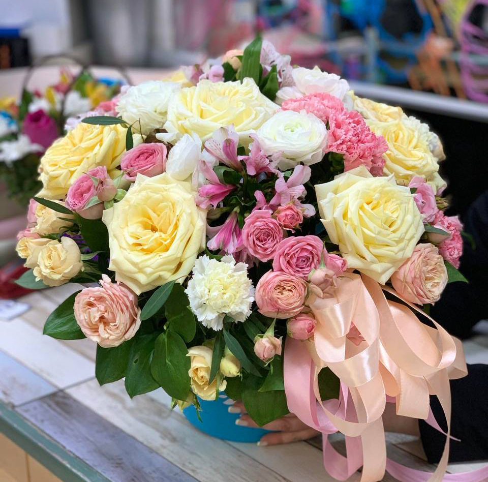 Состав: Розы, альстромерии, кустовые розы, гвоздики, зелень