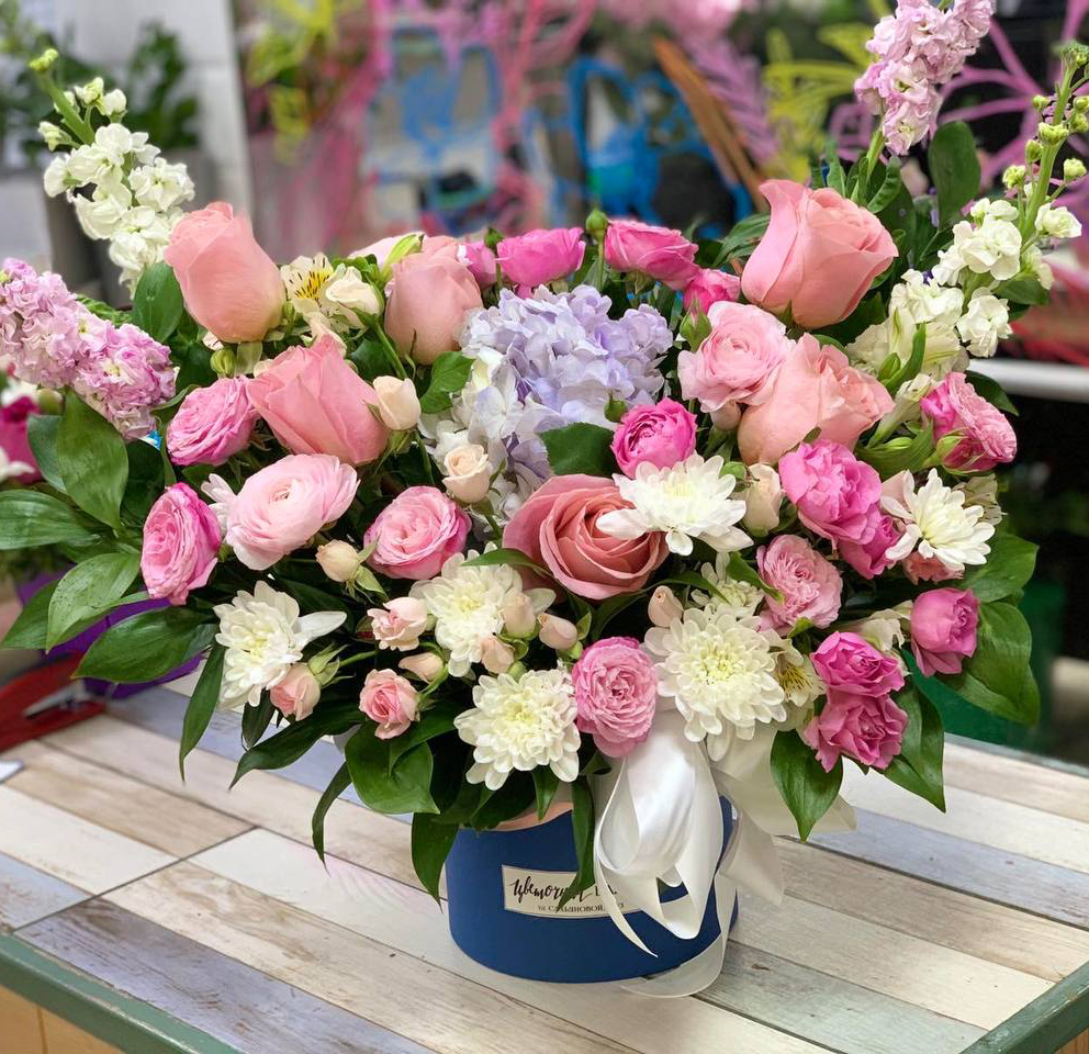 Состав : Гортензия, розы, матиола, ранункулюсы, кустовые розы, кустовые хризантемы, зелень.