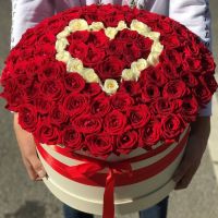 Композиция в форме сердца в шляпной коробке, в составе 125 белых и красных роз, атласная лента.