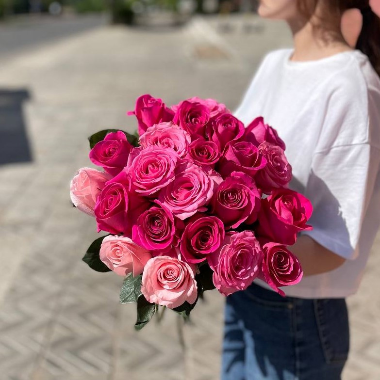 Акция! Розы микс (от 25 шт) нежно розового, ярко розового и малинового цвета купить с доставкой в Улан-Удэ за 3825 рублей | «Цветочный BAZAAR»