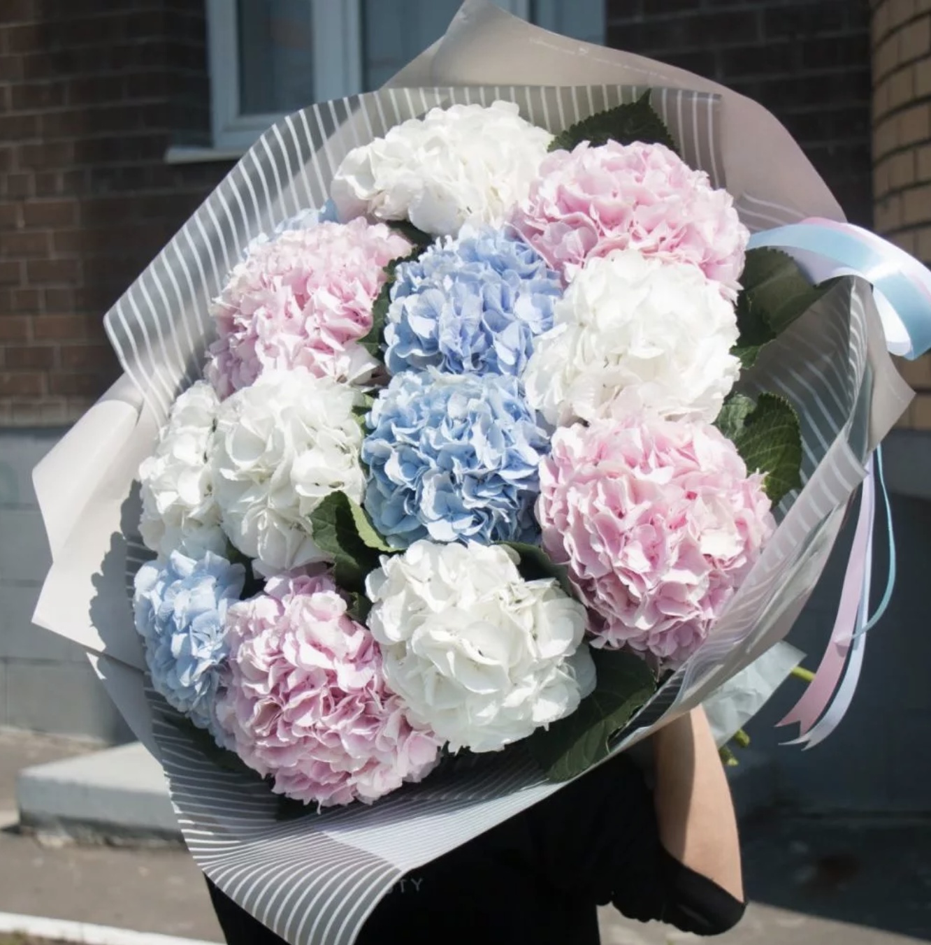 Букет из гортензий Колумбия цвет микс в стильном оформлении.