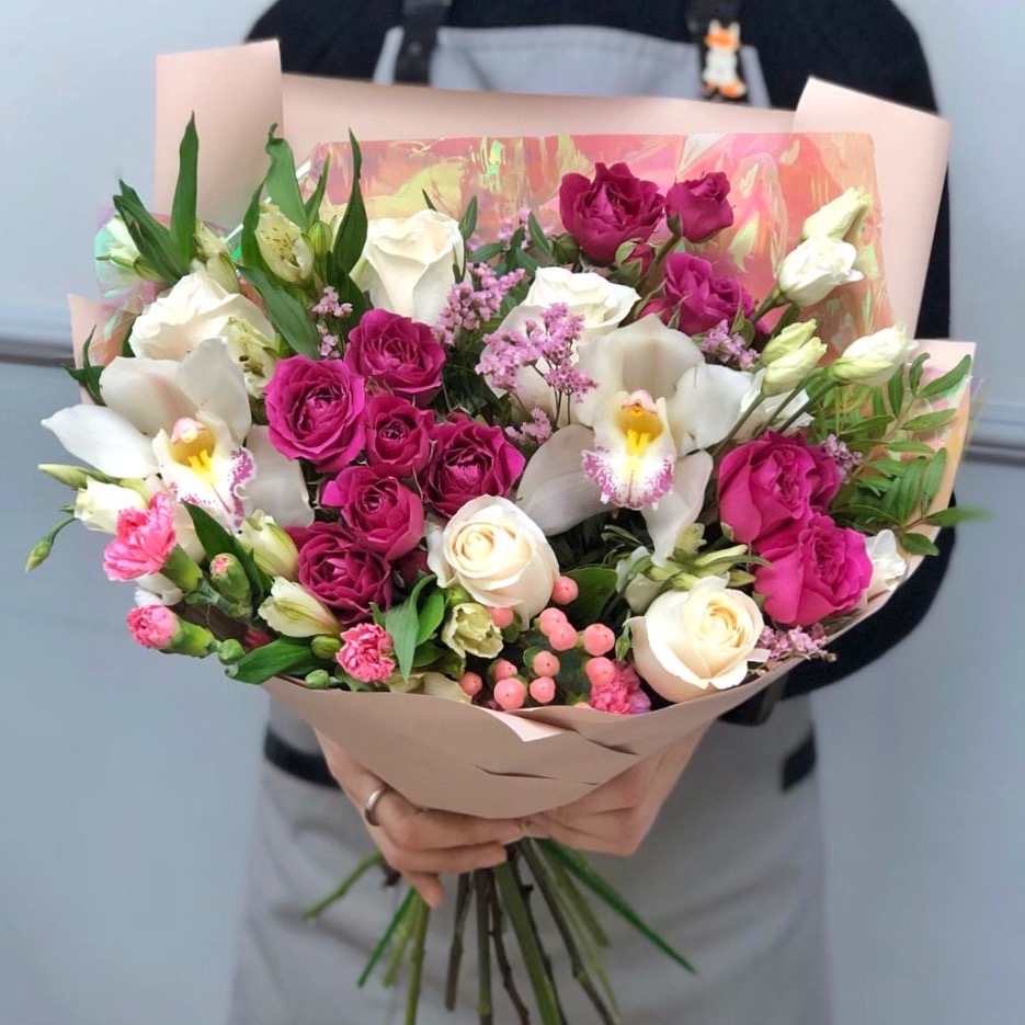 Сборный букет с орхидеями, кустовыми розами, гиперикумом, эустомой.