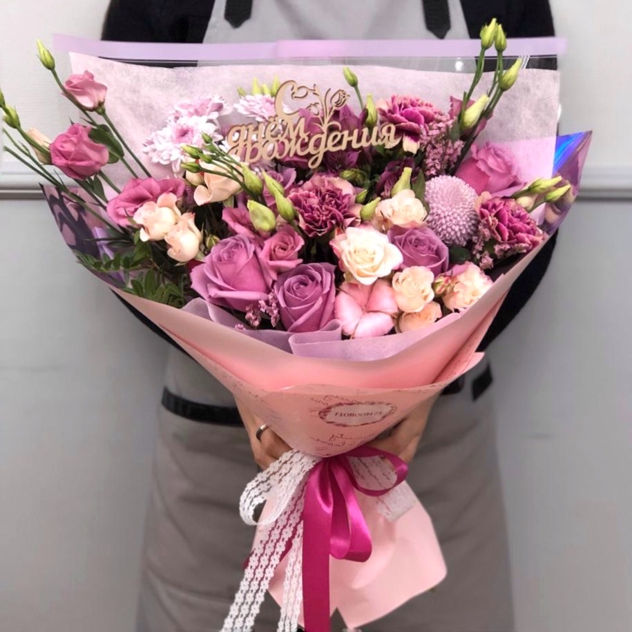 Сборный букет в розово-сиренвых тонах с диантусами, кустовыми розами, альстромерией, эустомой, розами Эквадор, кустовой и одноголовой хризантемой .
