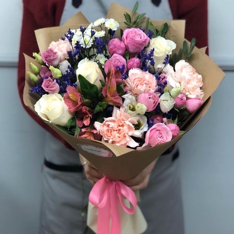 Сборный букет с диантусами, кустовыми розами, альстромерией, эустомой и розами Эквадор.