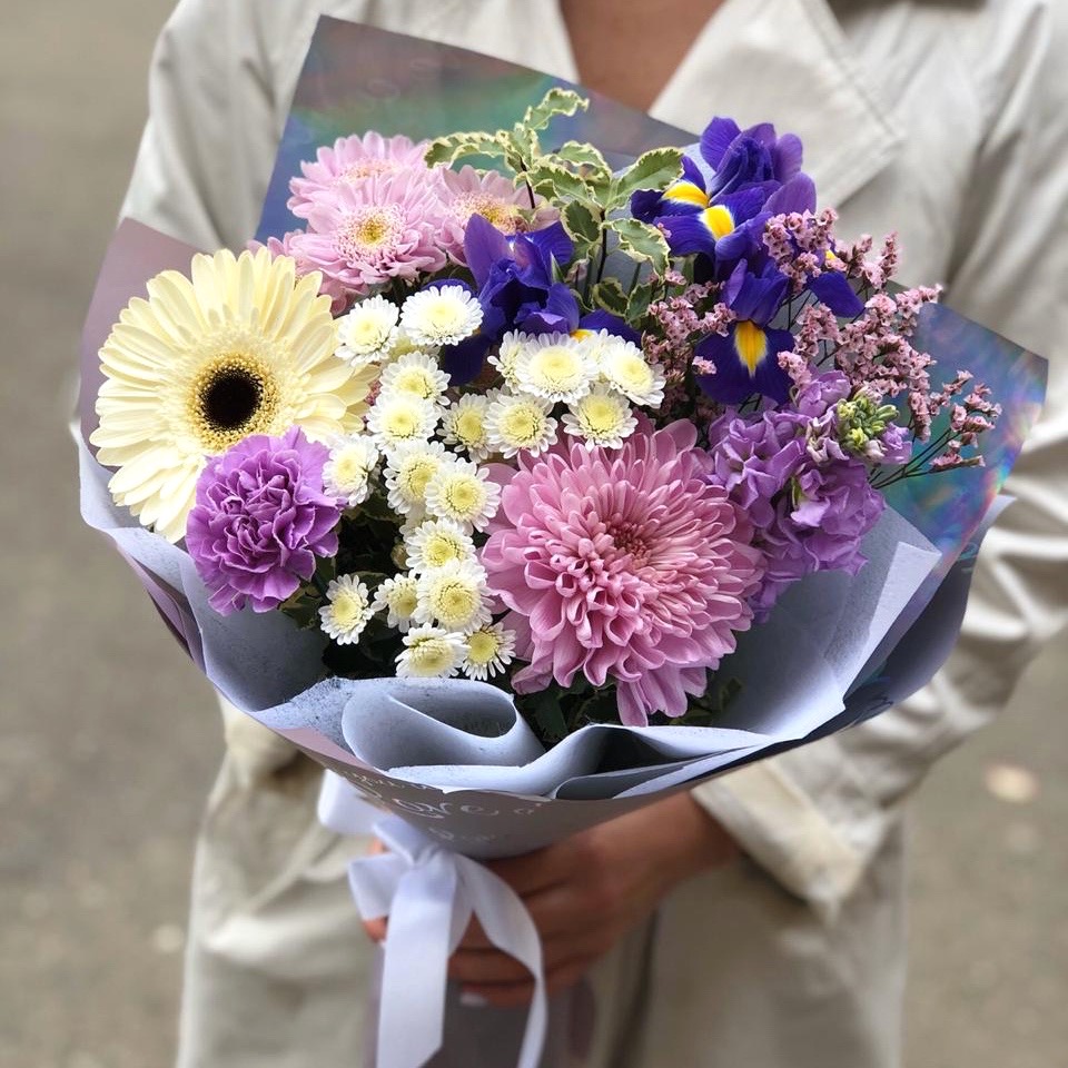 Сборный букет с кустовыми хризантемами, ирисами, маттиолой, лимониумом, герберой.