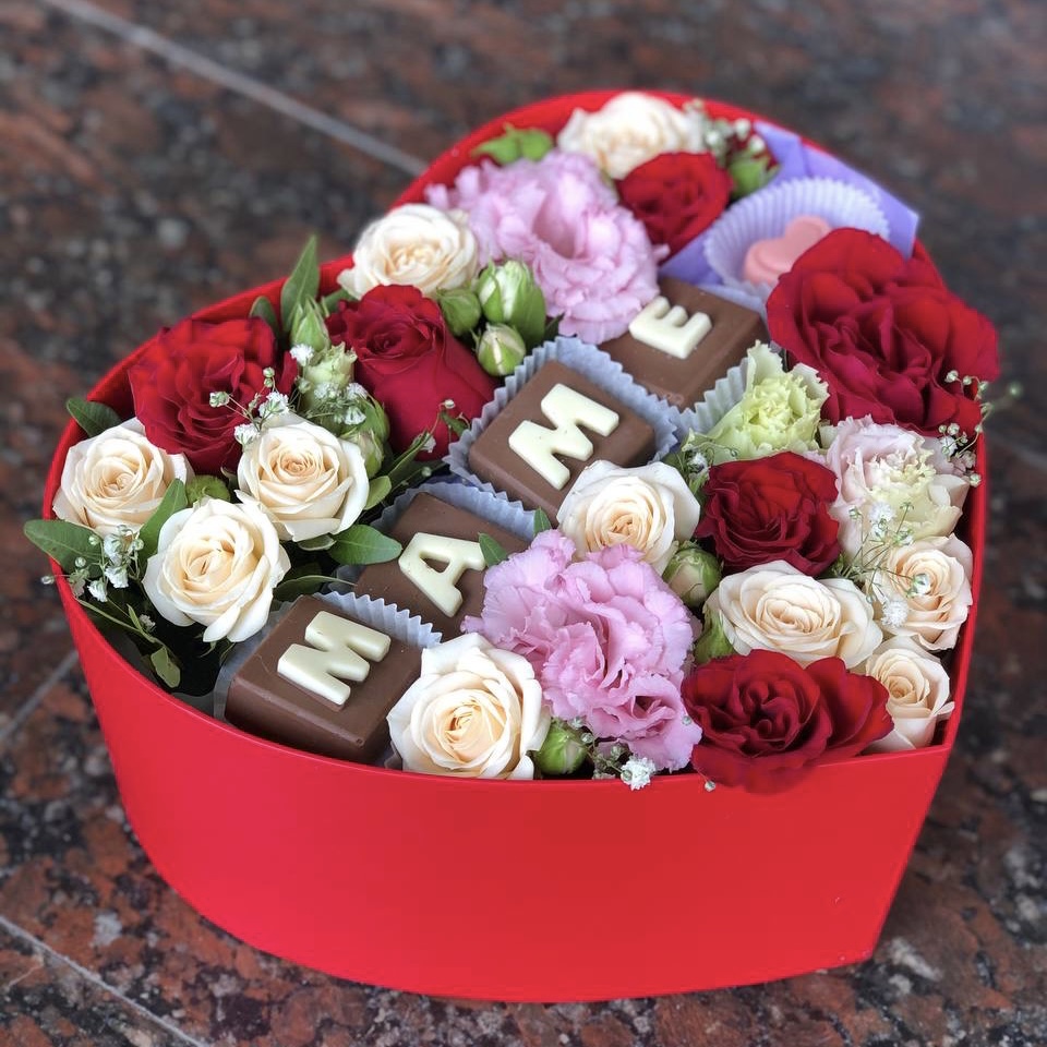 Композиция в форме сердца с цветами и шоколадными буквами "Маме". Цвет коробки подбирается из наличия.