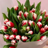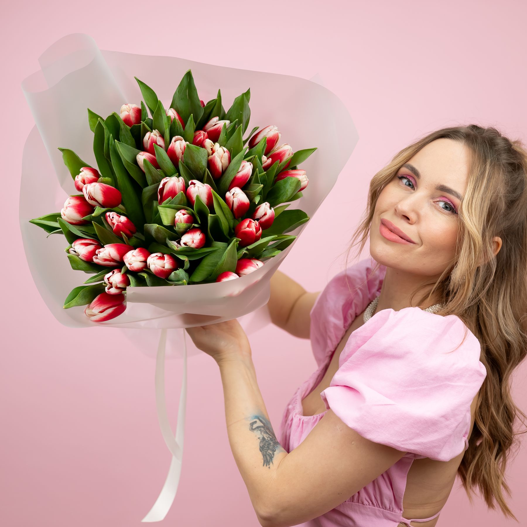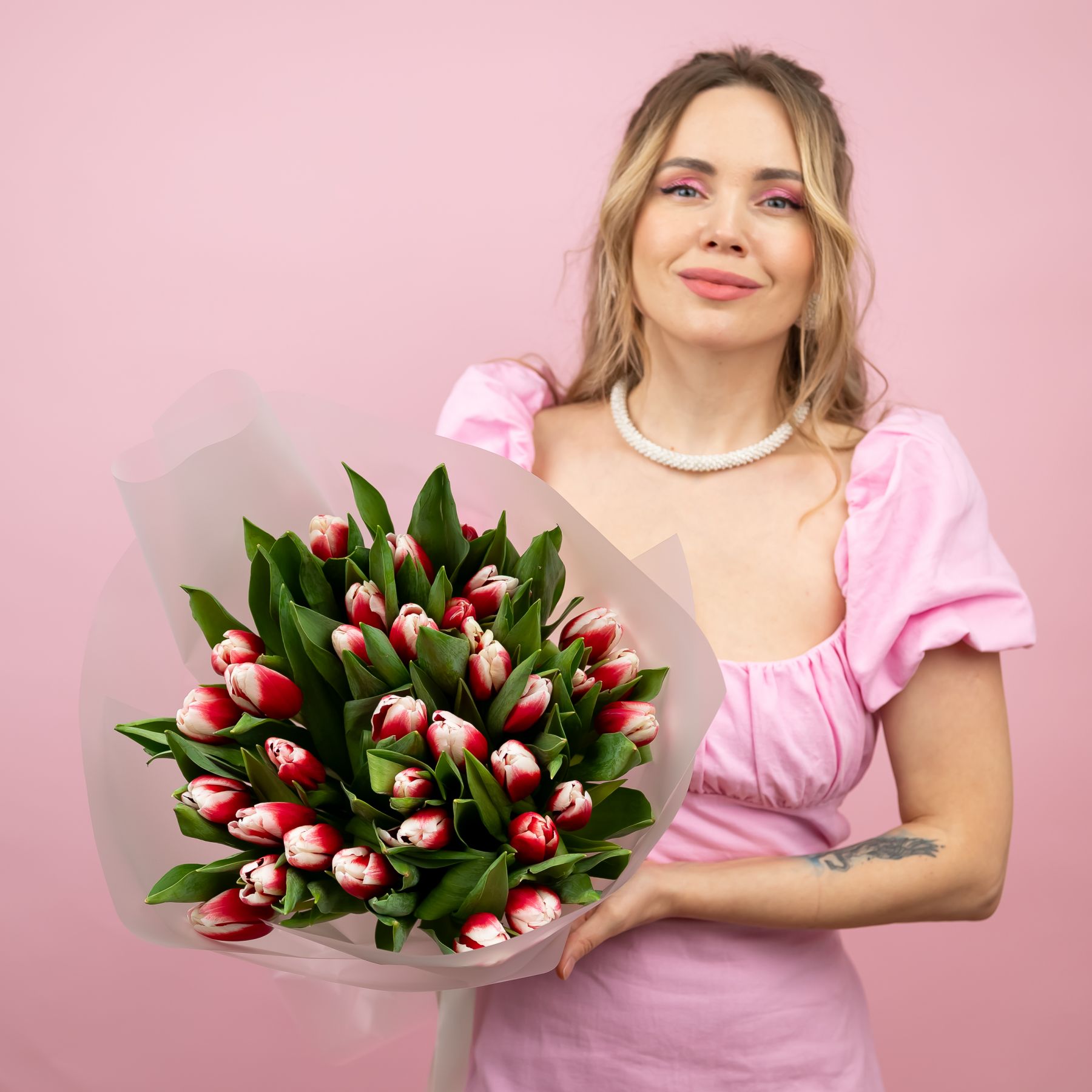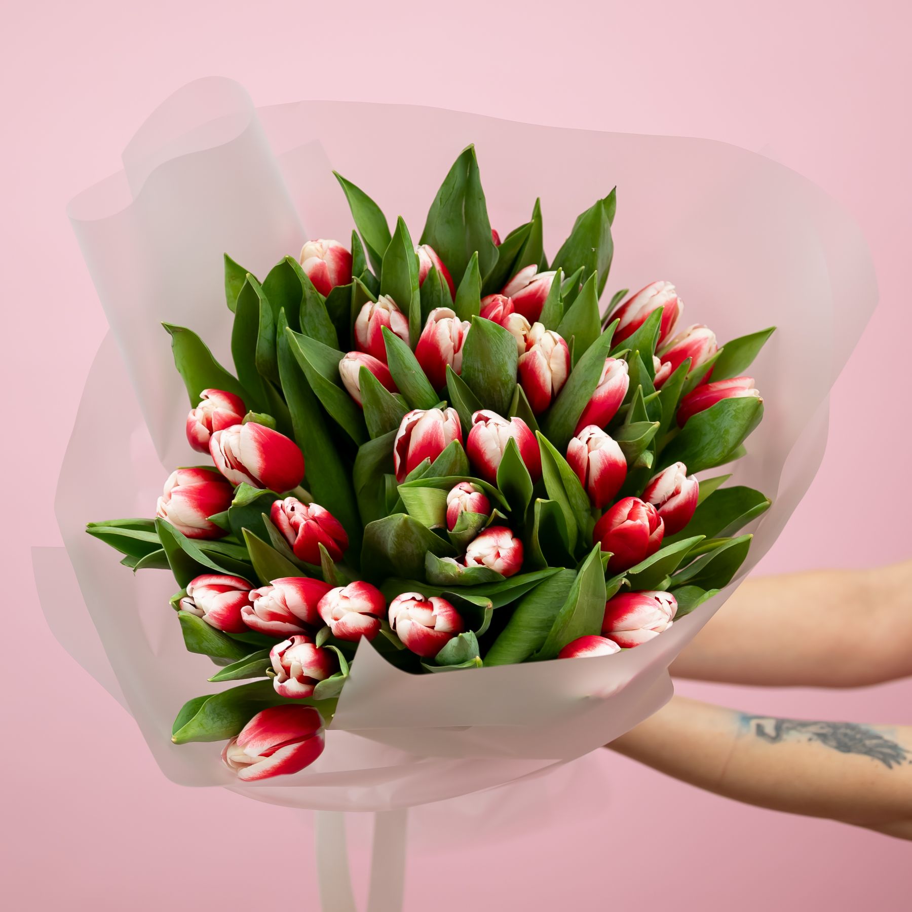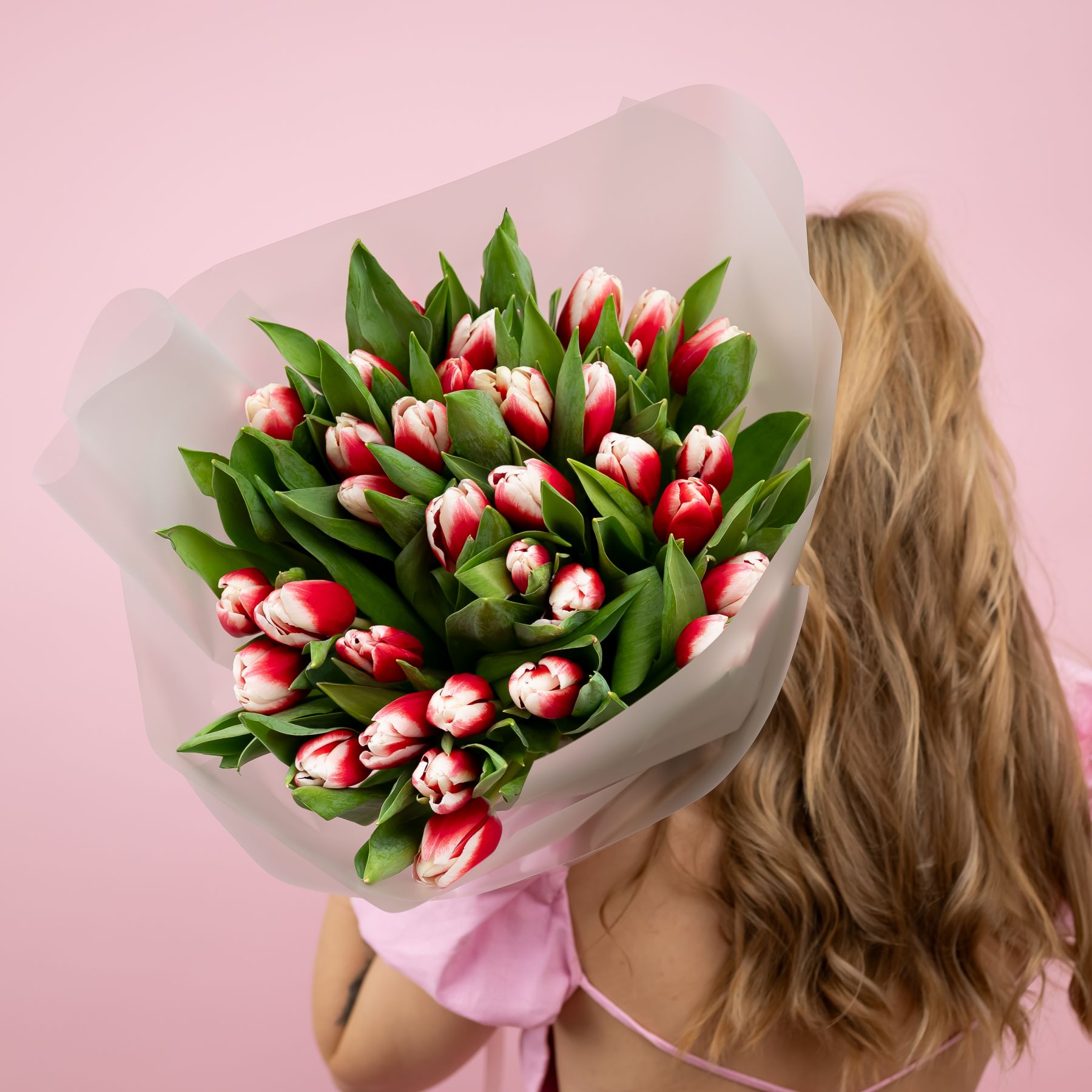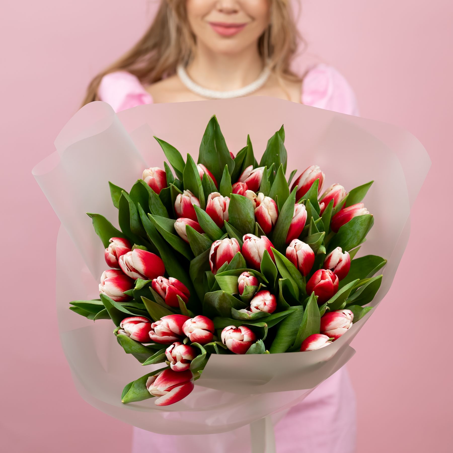 Тюльпаны красно-белые 35 шт в упаковке купить с доставкой в Улан-Удэ за 9350 рублей | «Цветочный BAZAAR»